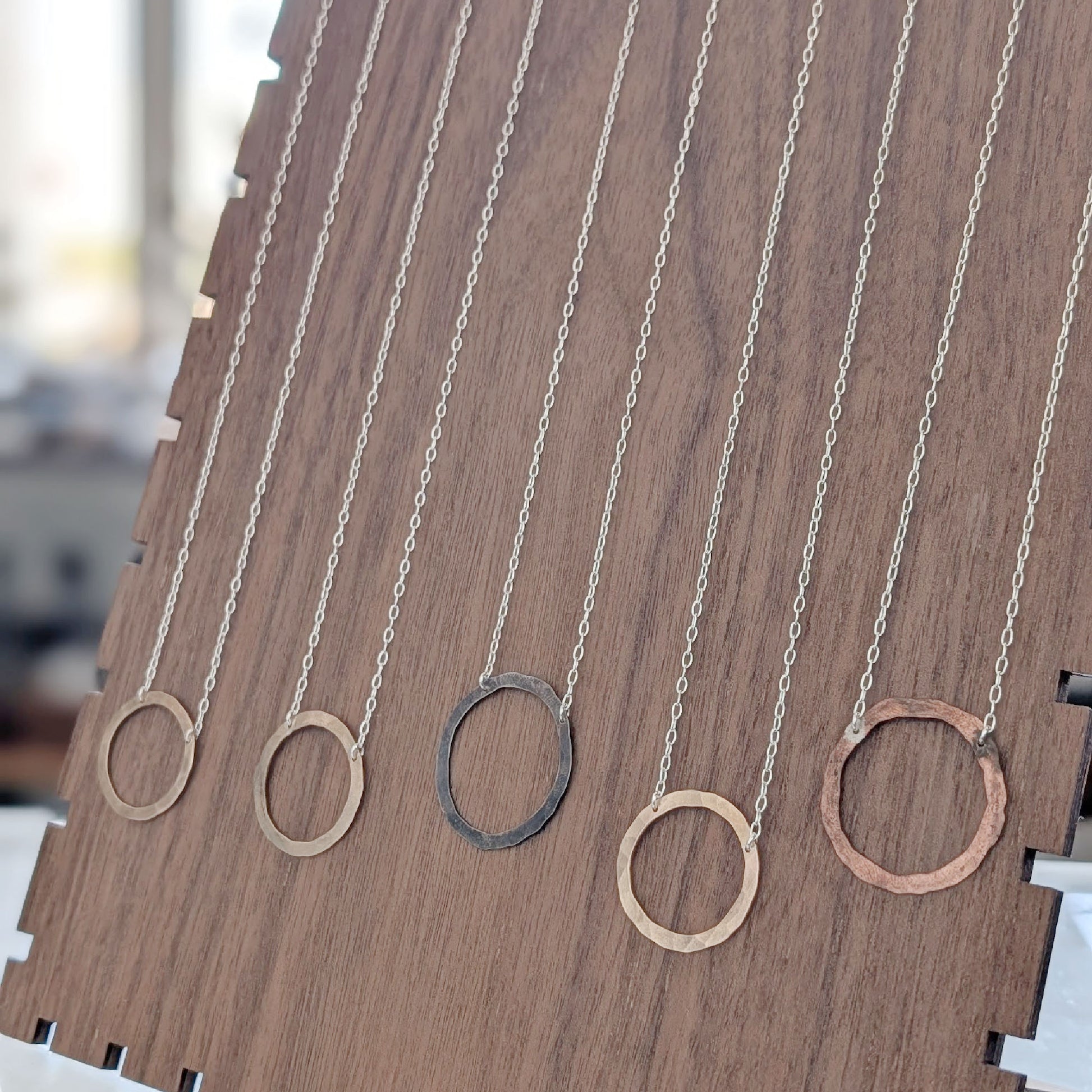Few-of-a-kind, small batch assorted handmade hoop necklaces with sterling silver, copper, bronze, brass and 14K gold dipped metals.