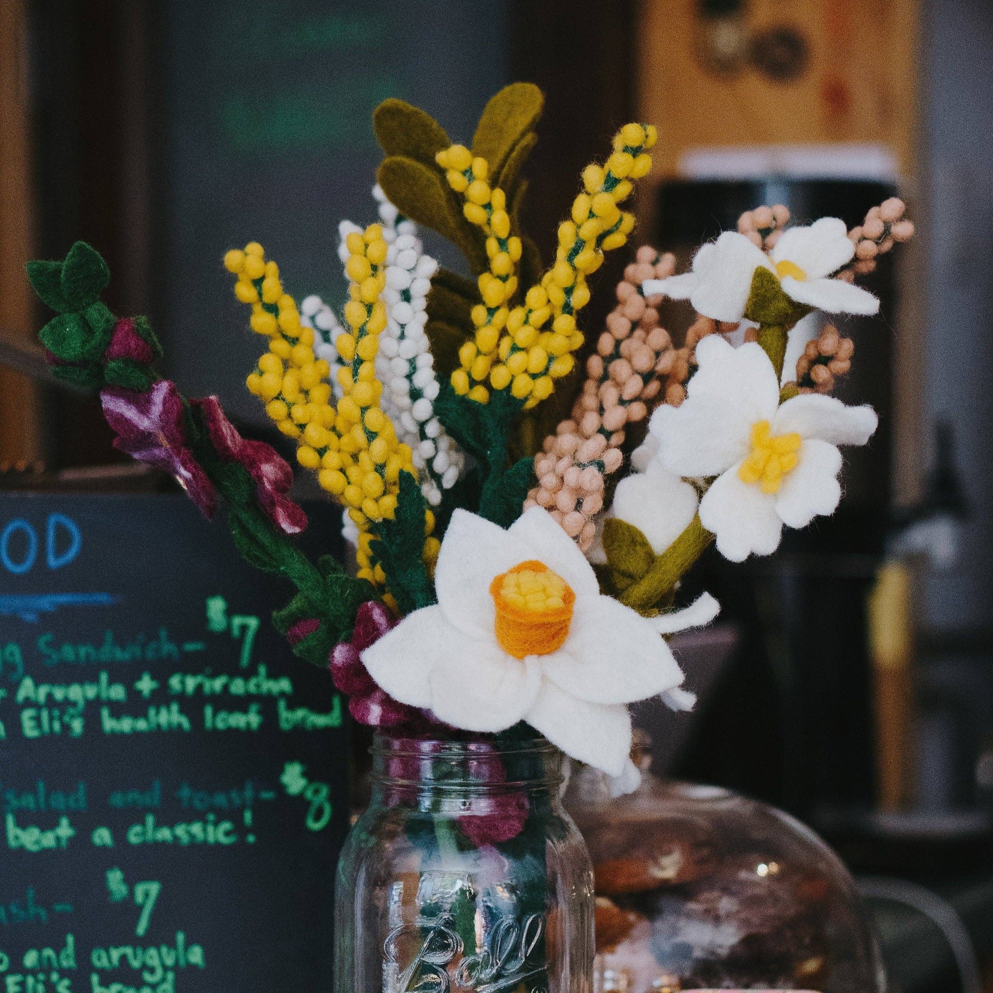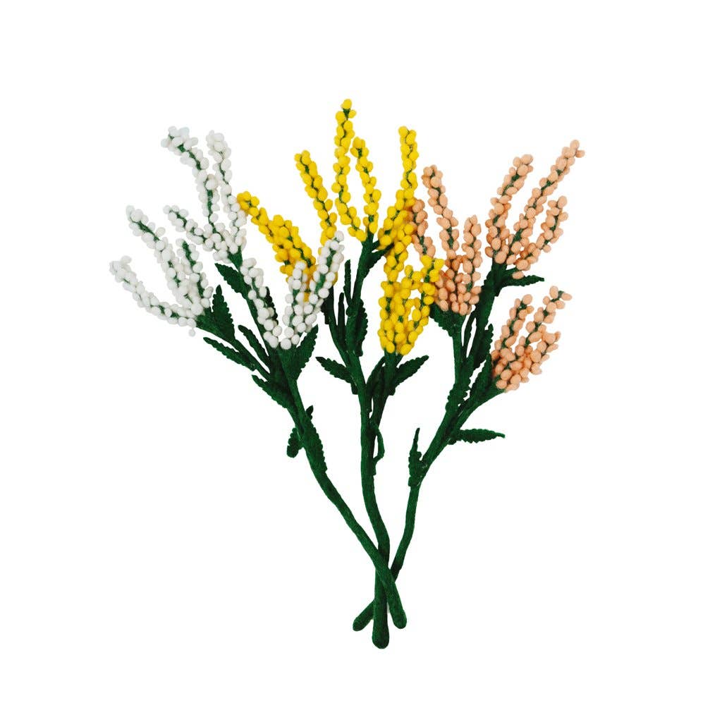 The Felt Baby's Breath Flowers have been at the top of everyone's wish list for many seasons! Finally, we have the perfect bulky filler that can be added to beautiful bouquets, yet bold enough to display on its own. Experiment with a fun and bright store display with these beautiful stems, brimming with tiny colourful baubles. Available in yellow, white, peach and *new* baby blue and lilac purple. With a bendable wire stem, these flowers can be styled in their own vase or bunched together with green leaves. Each flower is dyed, cut, and stitched by hand in Nepal.