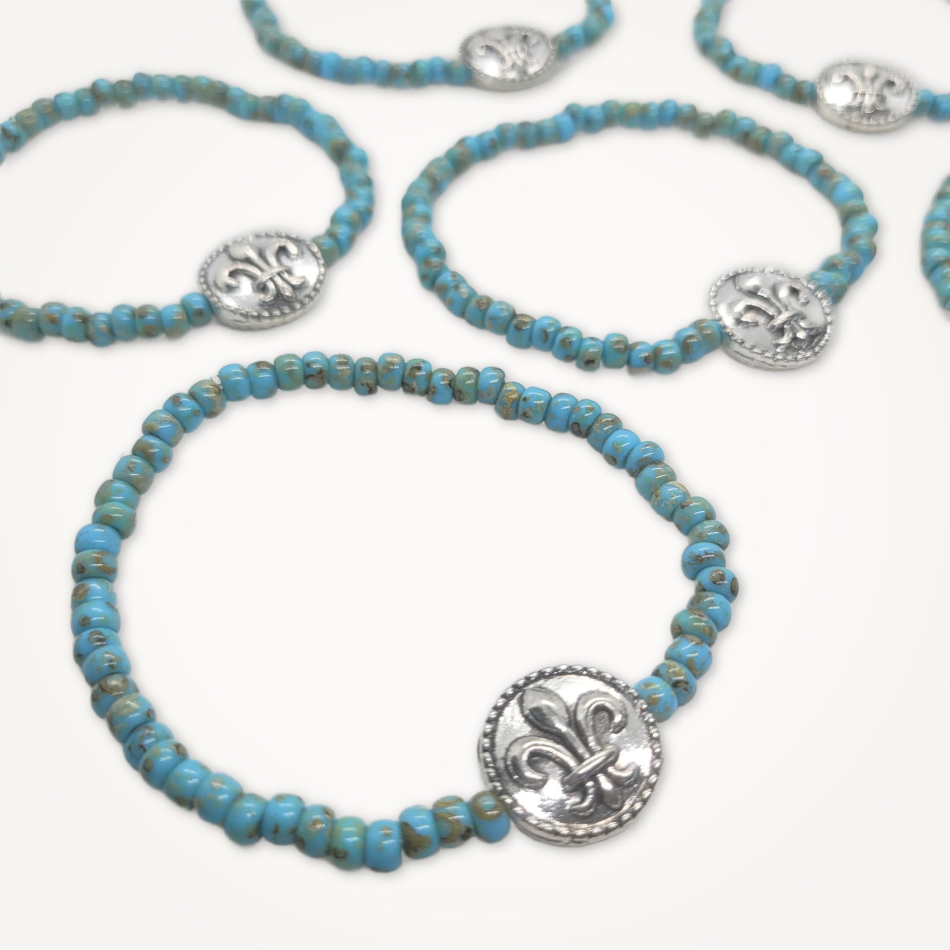 A silver fleur de lis medallion strung with your choice of vibrant jewel-toned bead. One size fits most.