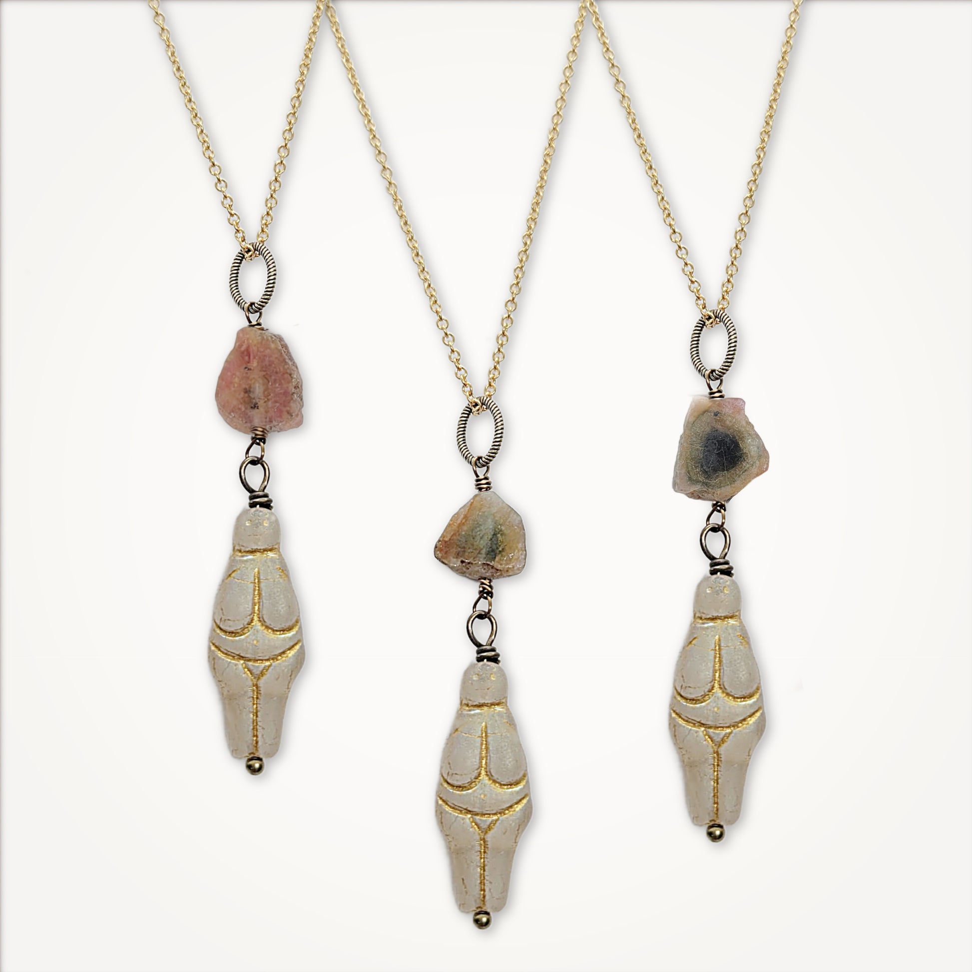 Our Goddess Necklace combines a matte gold-washed crystal pendant with a natural tourmaline slice, showcasing unique earthy hues of dusty pink, soft brown, and muted green-gray. Hanging 2.25 inches from your choice of a 14K gold dipped or antique brass 18-inch chain with a spring ring closure, this piece honors grounded beauty and divine femininity with quiet elegance.