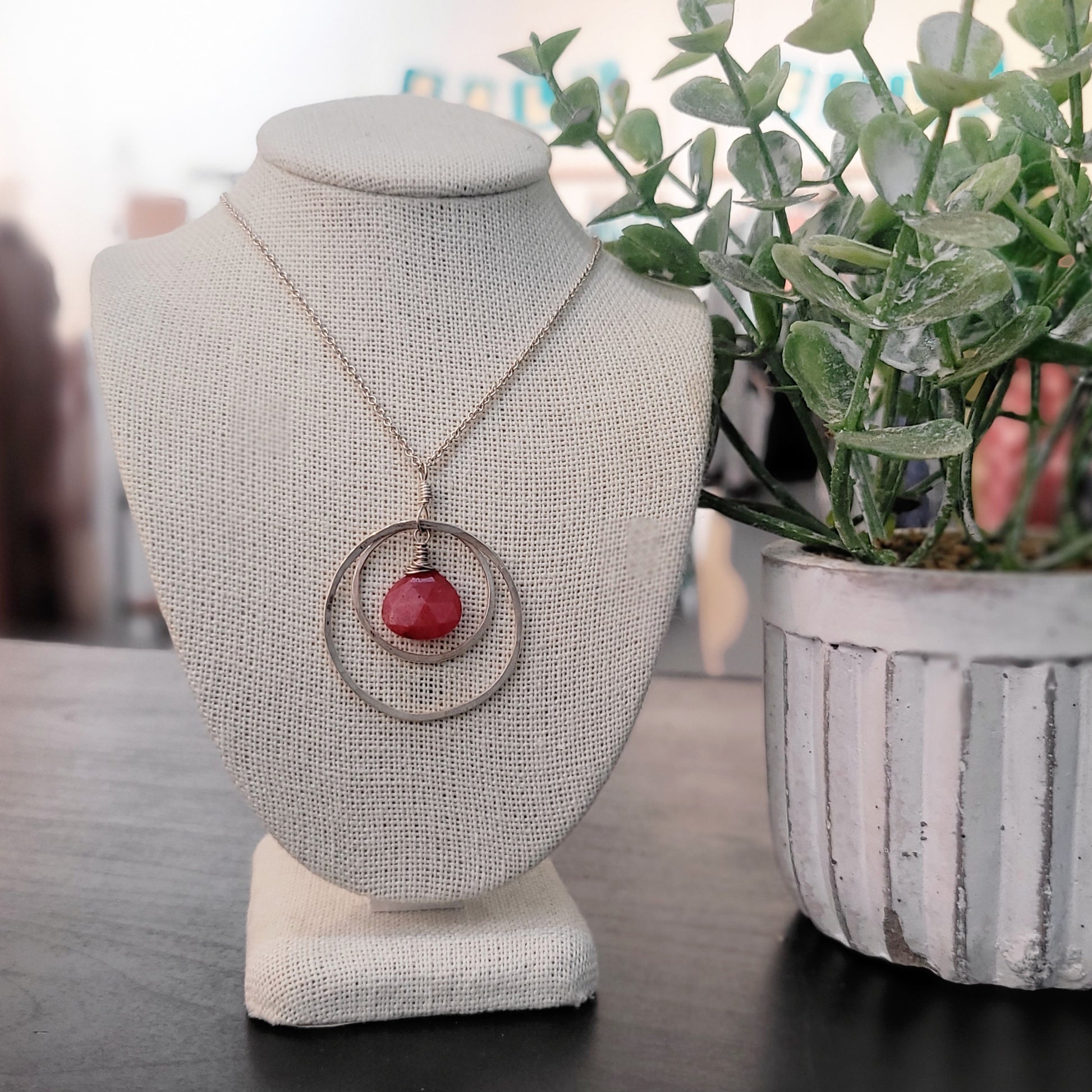 Elevate your style with our Red Sapphire Orbit Necklace. This stunning piece features two elegant hoops delicately suspended, showcasing a vibrant red sapphire teardrop. Add a pop of color to any outfit and make a statement with this unique and eye-catching necklace.